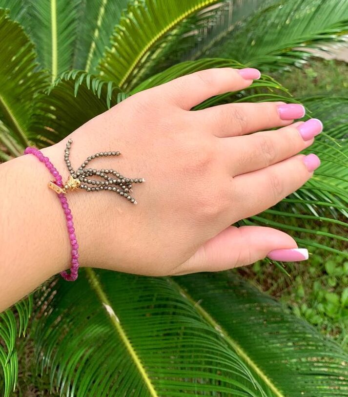 Pulseira de rubi com tassel em pirita, banhada a ouro 18k.