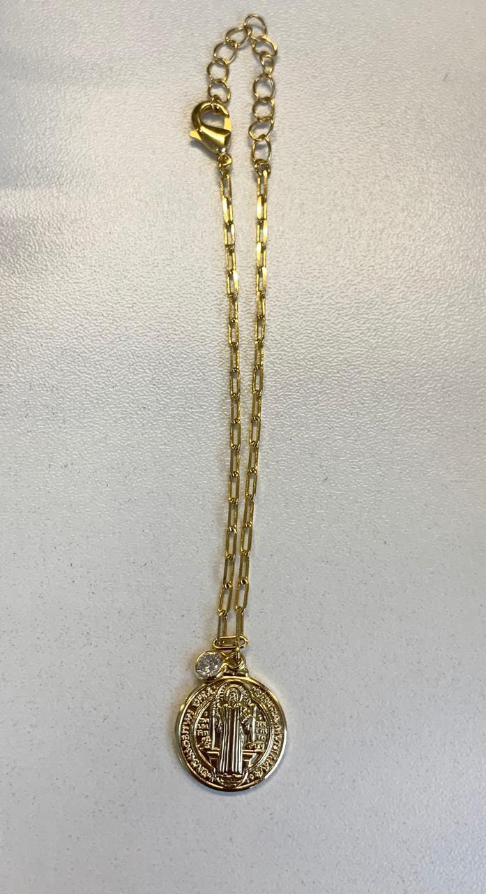Pulseira elos, com pingente de São Bento e ponto de luz, banhada a ouro18k.