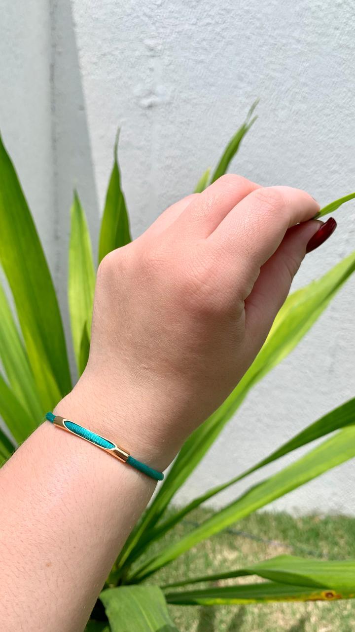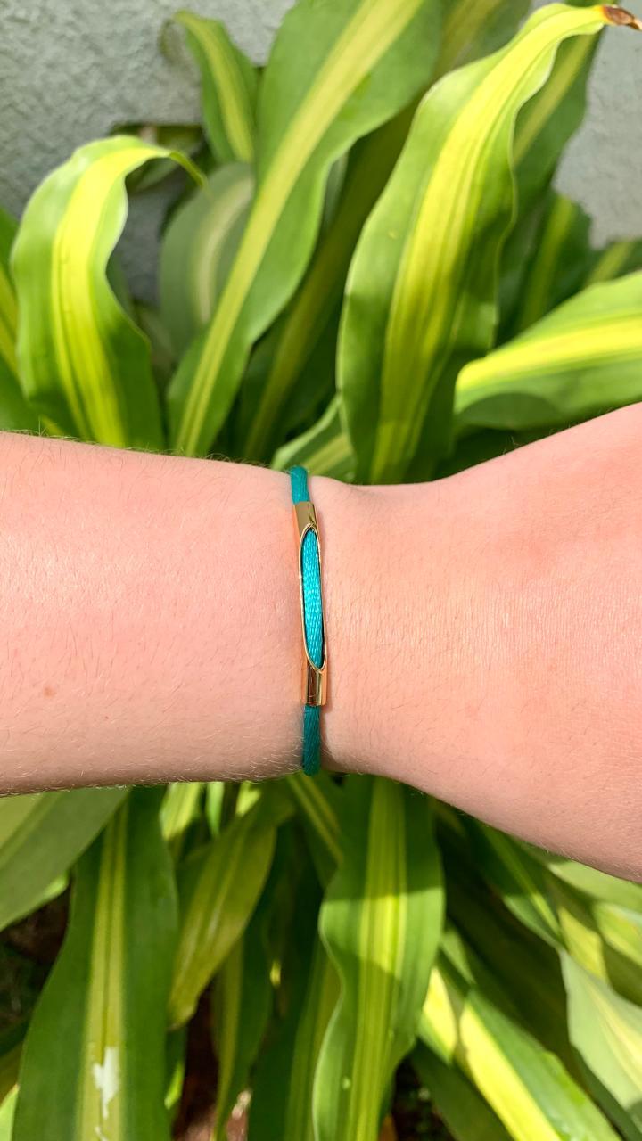 Pulseira fio de seda azul com detalhe banhado a ouro18k.