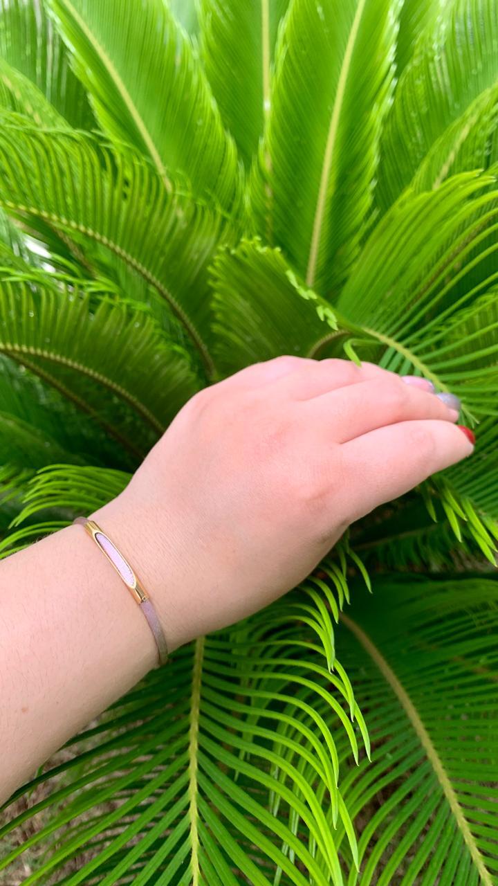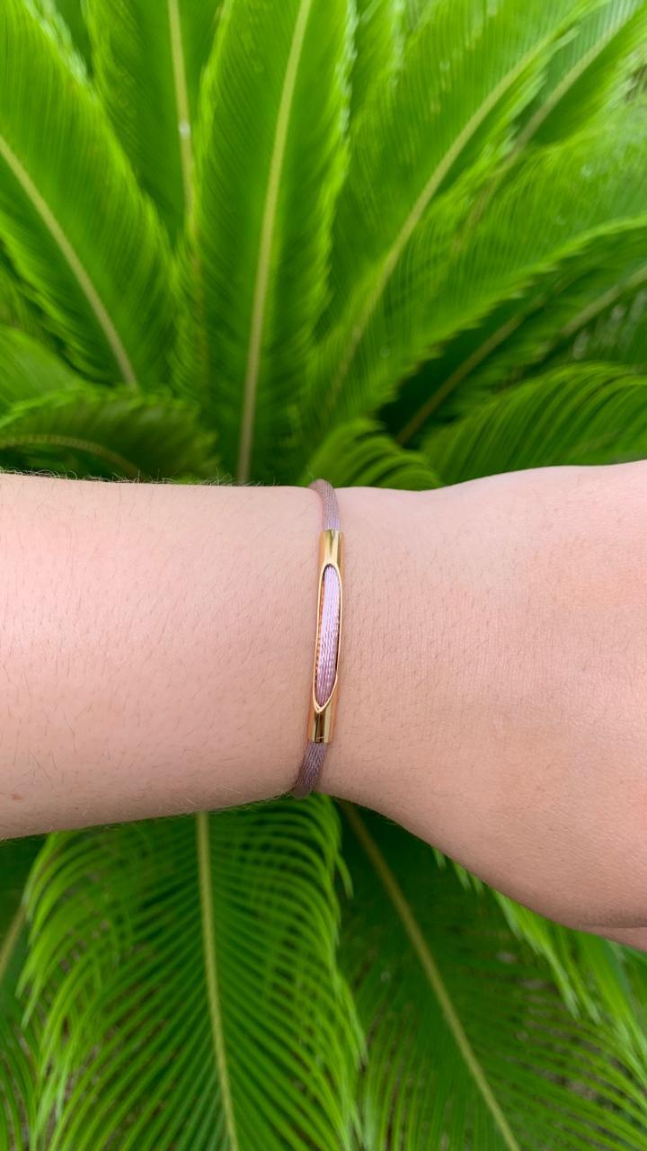Pulseira fio de seda rosa claro com detalhe banhado a ouro18k.