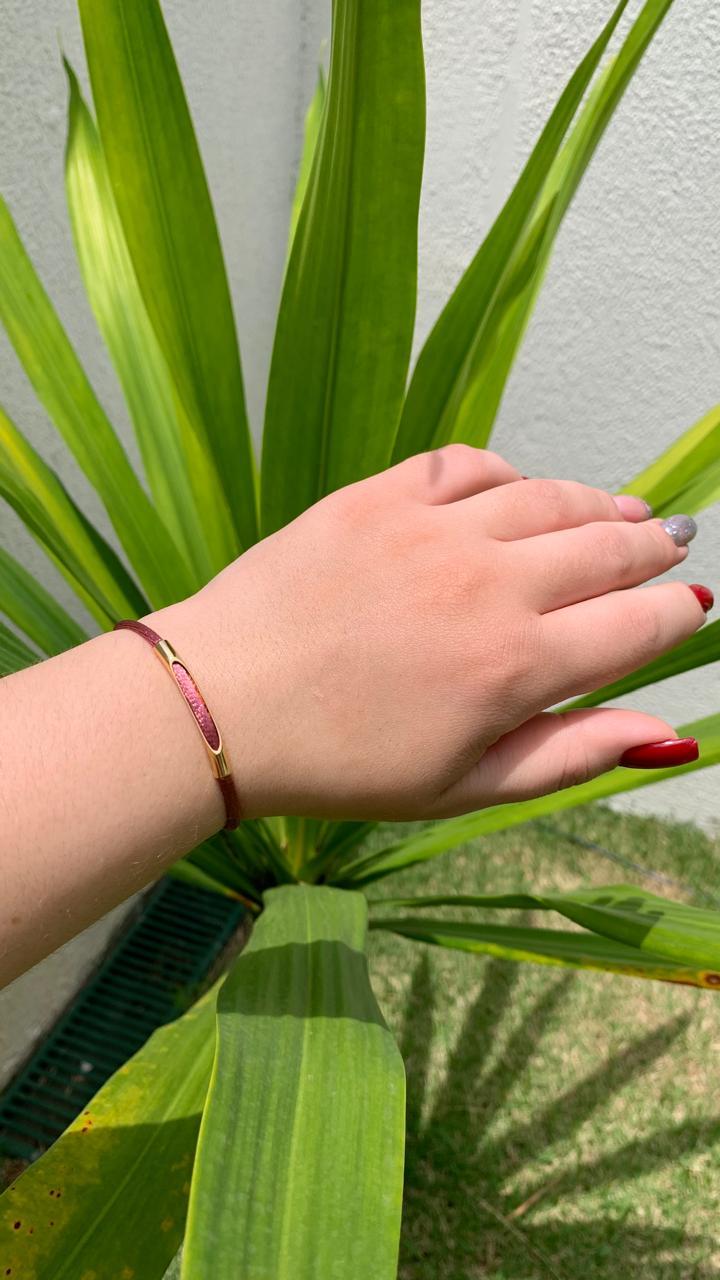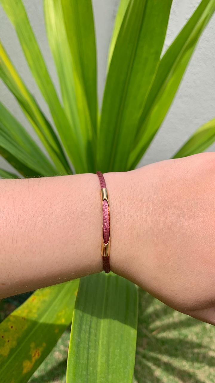 Pulseira fio de seda rosa com detalhe banhado a ouro 18k.