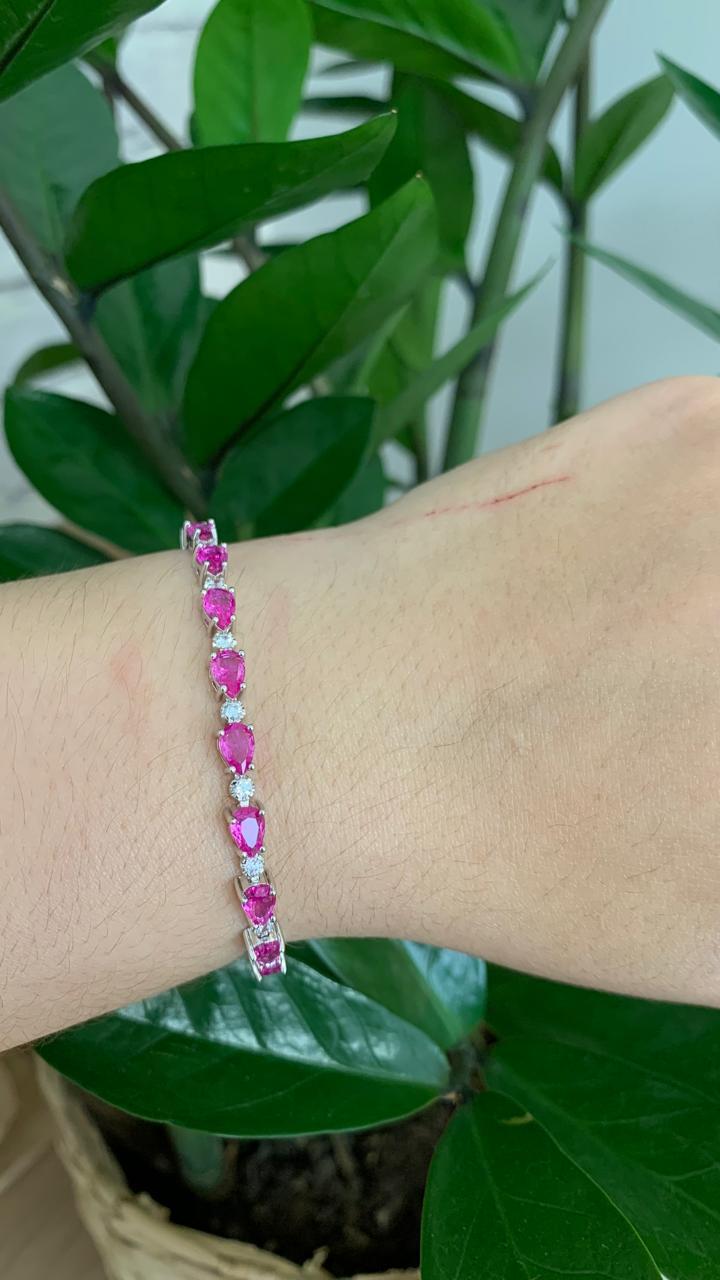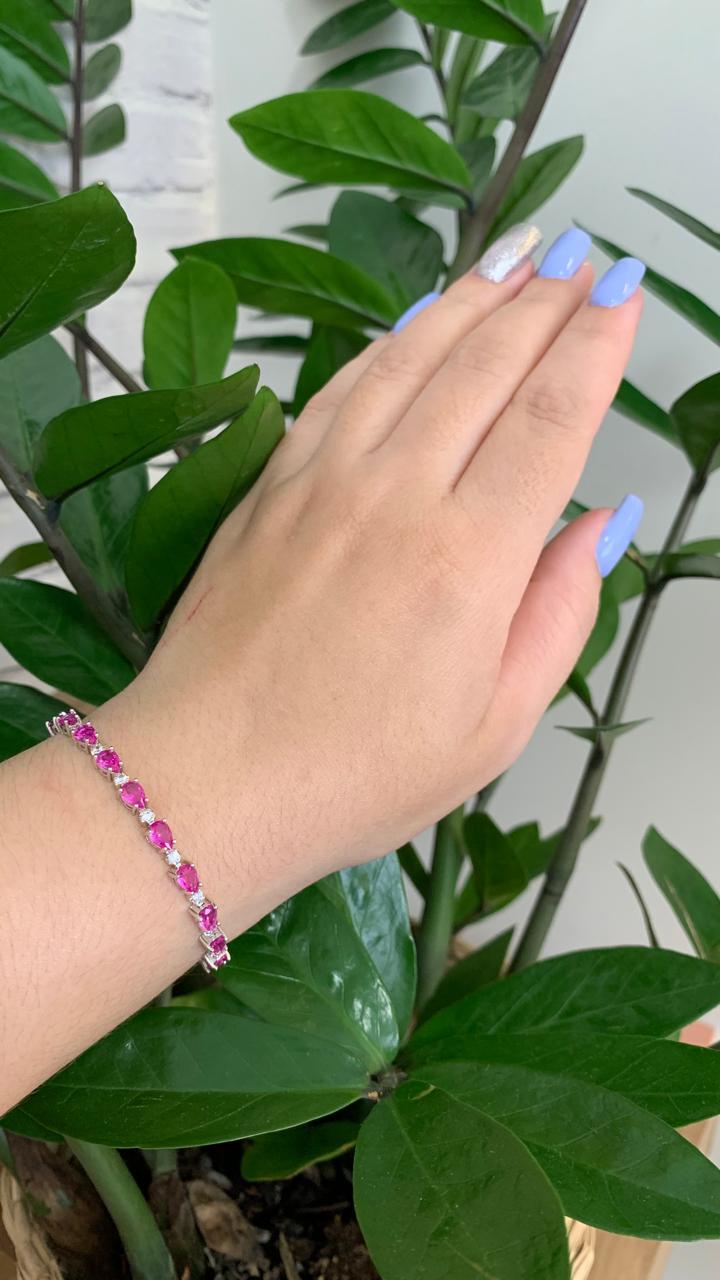 Pulseira riviera gotas de safira pink 6mm, com 17cm, em ródio branco.