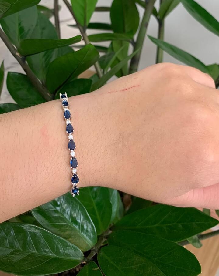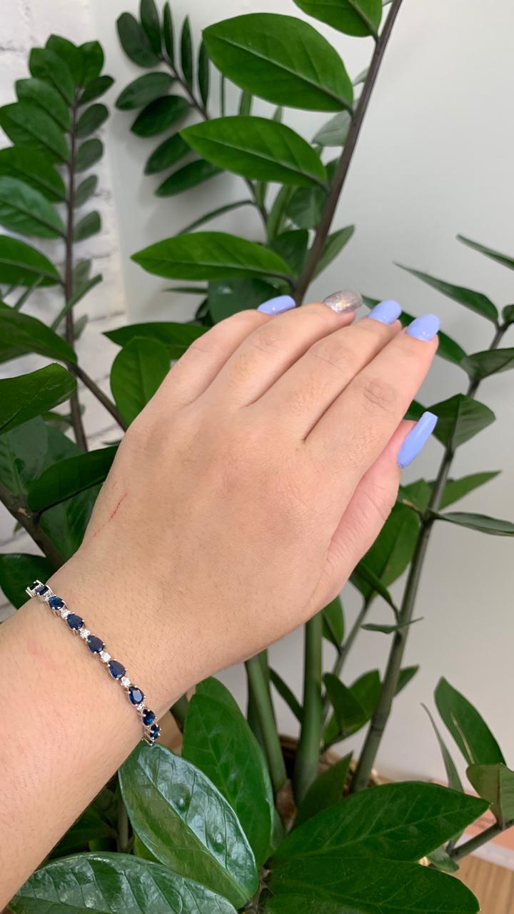 Pulseira riviera gotas de safira 6mm, com 17cm, em ródio branco.