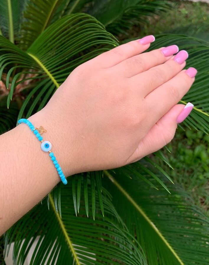 Pulseira howlita turquesa com olho grego em madrepérola e Espírito Santo, banhado a ouro18k.