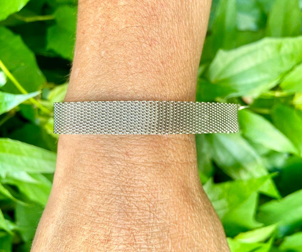 Pulseira malha em ródio branco, com 17cm de comprimento mais 4cm de extensor.