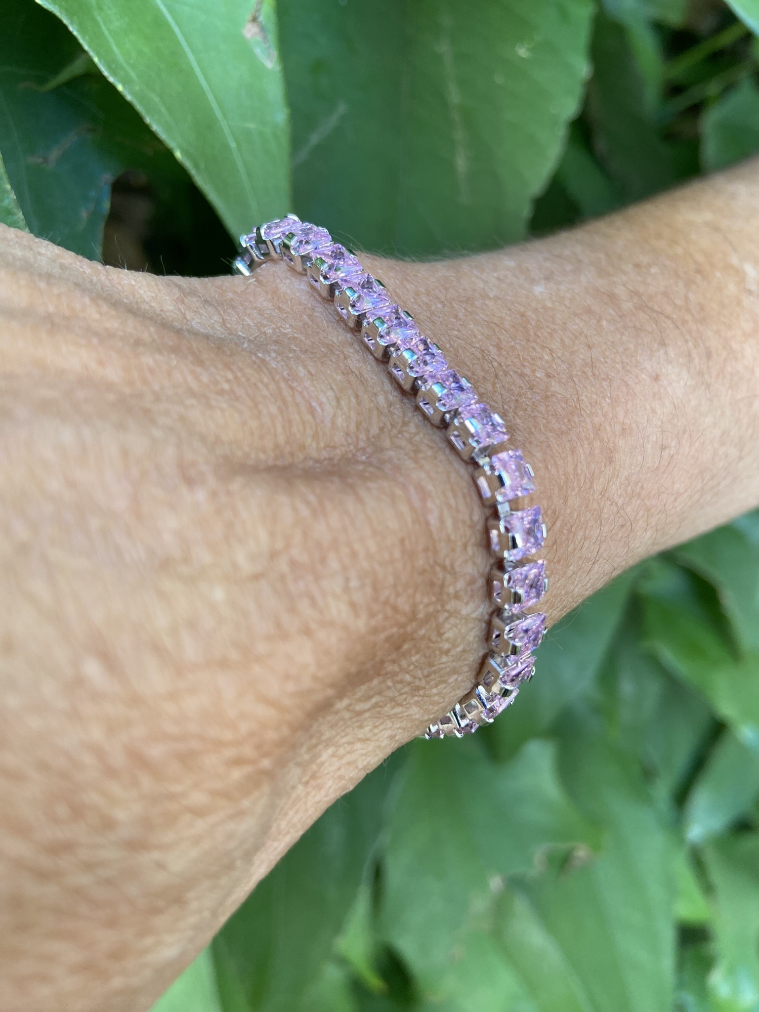Pulseira riviera, com 20cm de comprimento, com cristais rosas, em ródio.