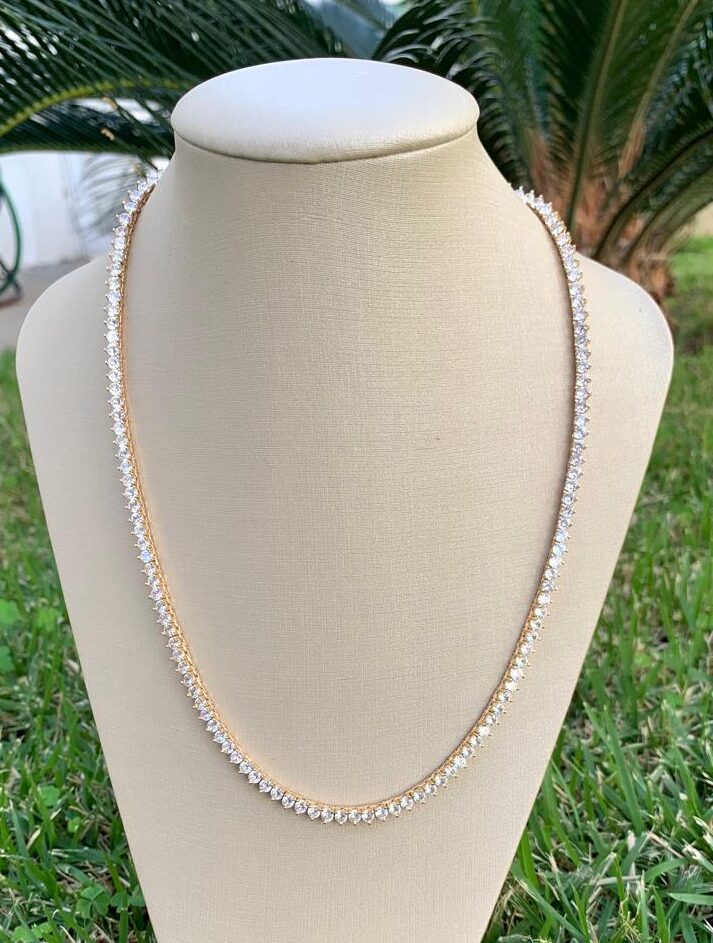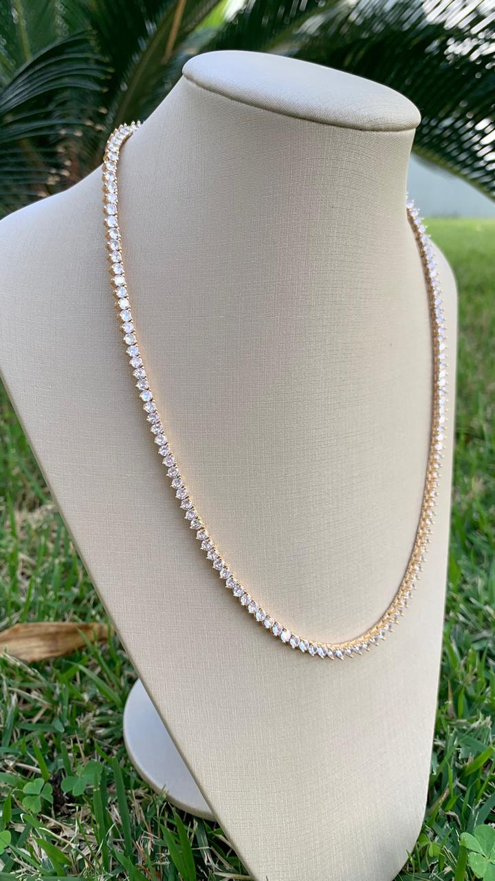 Riviera banhada a ouro 18k, com 45cm de comprimento, cravejada com zircônias.