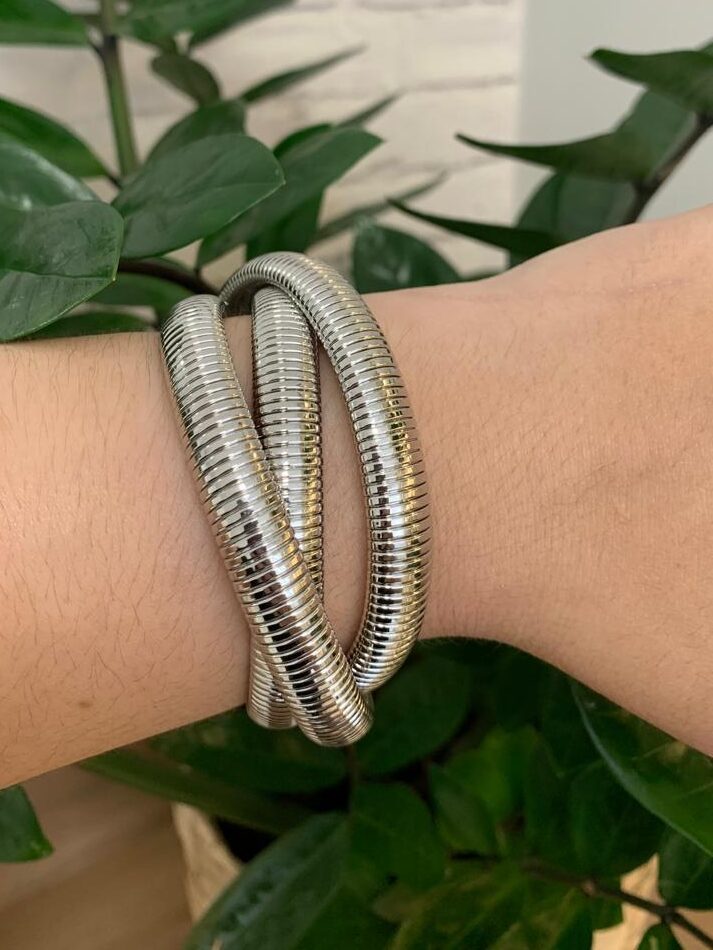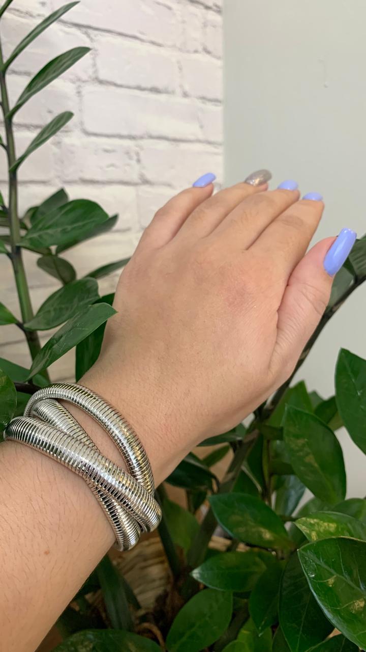 Trio de pulseiras entrelaçadas malha, em ródio branco.